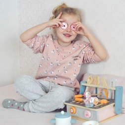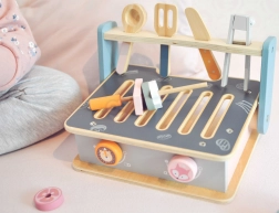 Dette stilfulde trækøkken 2-i-1 kombinerer klassisk madlavning med grill. Takket være den sammenklappelige konstruktion kan det let tilpasses både pladsen og den lille koks præferencer. To kogeplader med drejeknapper giver legen et realistisk præg og lader børn øve finmotorik og fantasi.