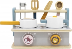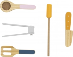 Alt, hvad der behøves til de første opskrifter: to gryder og grundlæggende redskaber (kniv, ske, spatel, tang), spydpinde og træmad som kød, æg og grøntsager. Det farverige design indbyder til leg og understøtter rollen som lille kok.