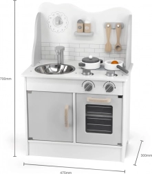 Legekøkkenet POLARB Eco Grey er en gennemtænkt legetøjsløsning for små kokke, som kombinerer sjov og udvikling af færdigheder. Den robuste trækonstruktion med giftfrie farver i “polare” nuancer virker elegant og tåler daglig leg. Børn kan prøve at tilberede mad på kogepladen, bage i ovnen og vaske op i vasken – præcis som de voksne.