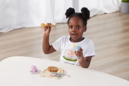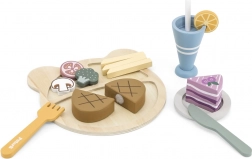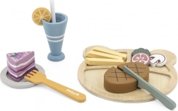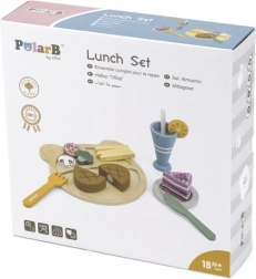 Den trælunchtallerken POLARB fra VIGA er klar til at servere lækkerier med stil. På tallerkenen kan børn arrangere bøf, pomfritter, grøntsager og dessert og “skylde ned” med en drik med sugerør. De realistiske tilbehør inviterer til at efterligne de voksne og udvikler selvstændighed og ordforråd.