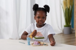 Farverige madstykker, dessert og drik gør det muligt for børn at servere frokost som i virkeligheden og øve grundlæggende bordskik.