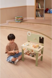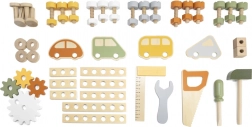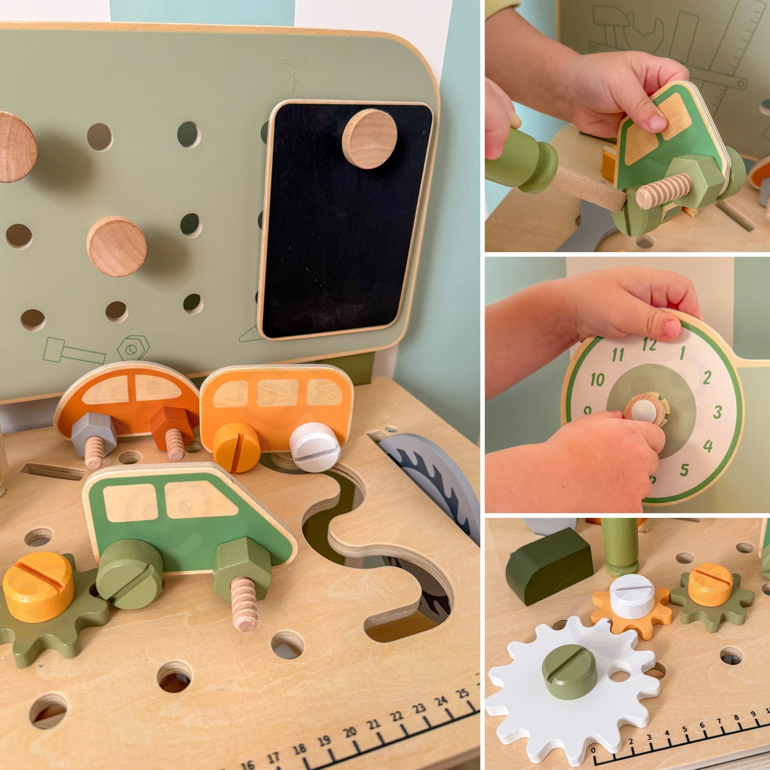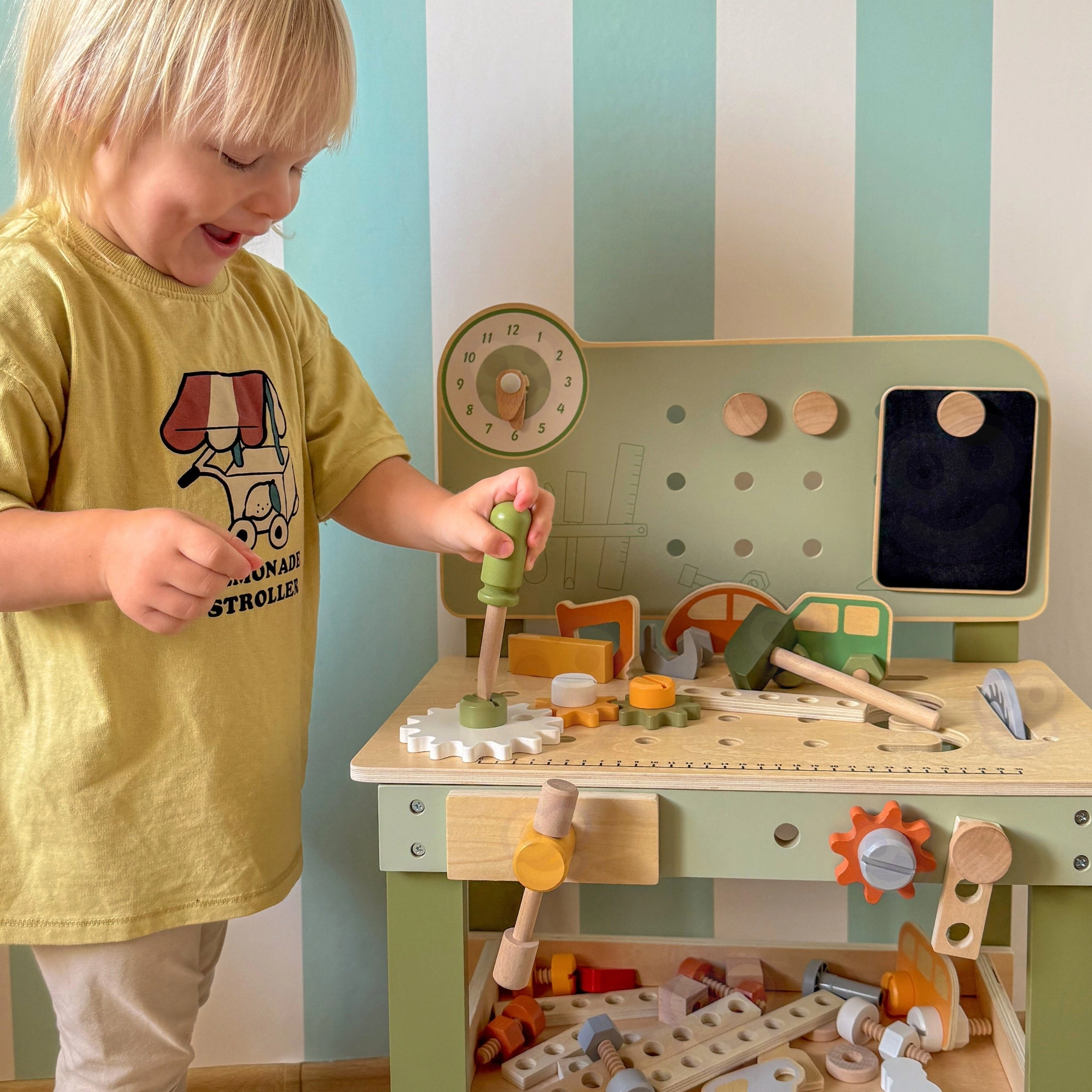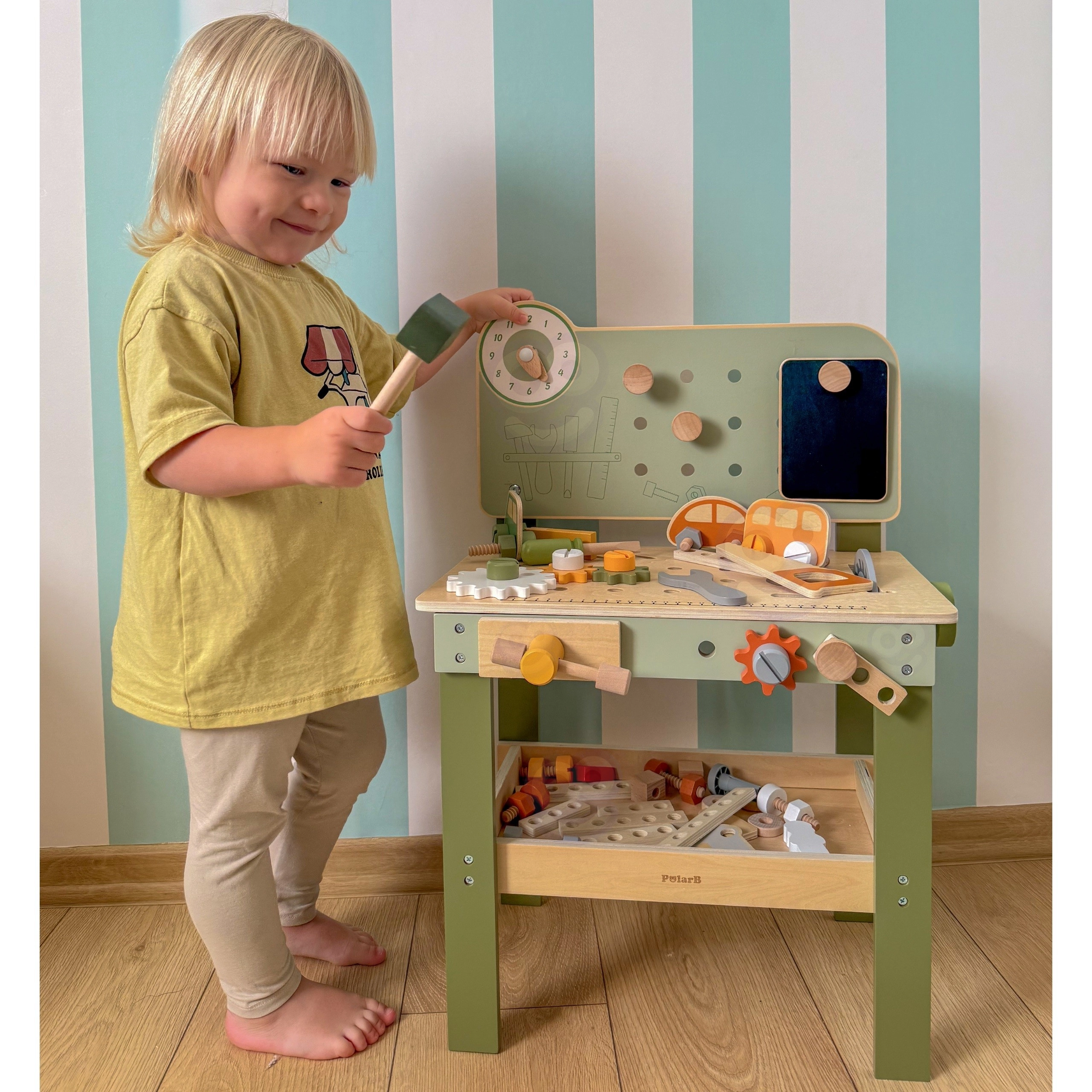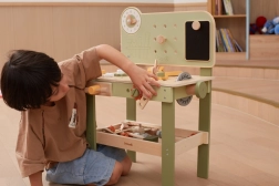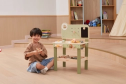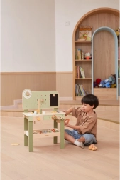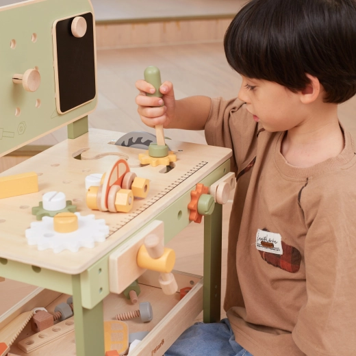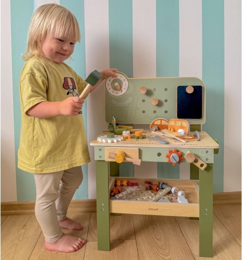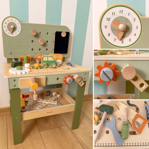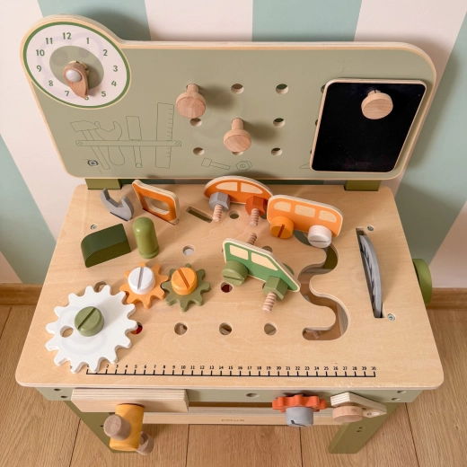 Leg med arbejdsbænken understøtter finmotorik, hånd-øje-koordination, logisk tænkning og kreativitet. Den træbaserede udførelse er holdbar og behagelig at røre ved, hvilket gør den velegnet til daglig leg derhjemme og i børnehaven.
