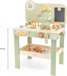 Det stilfulde børnearbejdsbord i natur-grønt design giver en realistisk værkstedsoplevelse i en sikker, træbaseret udgave. Børn kan skrue, skifte hjul på bilen, “save” dele, samle tandhjul og udforske årsag-virkning. Takket være den overskuelige opbevaring er alle dele og værktøj altid lige ved hånden.