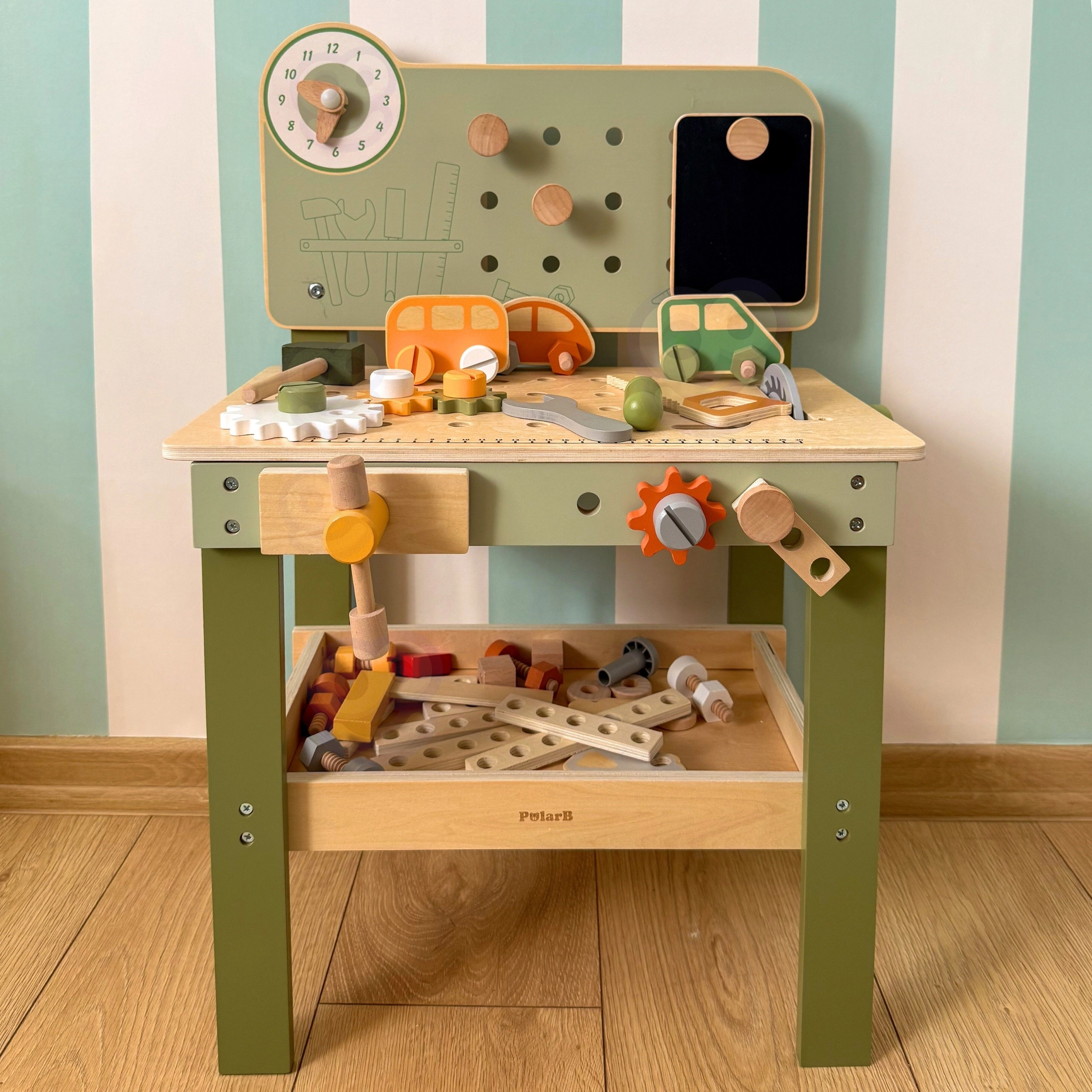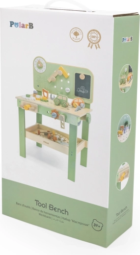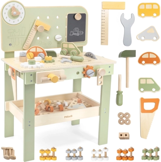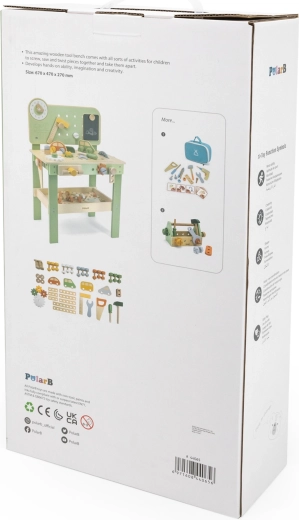 Opdag et kvalitets træværksted til børn fra den eksklusive serie POLARB fra VIGA. Små gør-det-selv-arbejdere kan hamre søm, stramme skruer med nøgle, fastgøre plader og tandhjul og på legende vis træne finmotorikken. Inkluderer ur med visere, en træ bil, en praktisk hylde til værktøj og en tavle til tegning for endnu mere sjov.