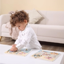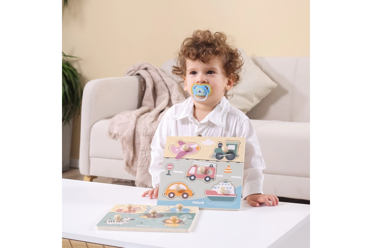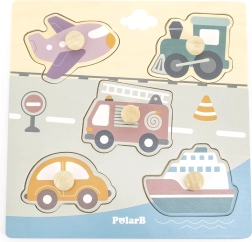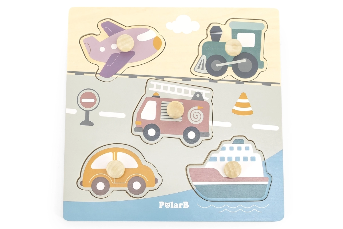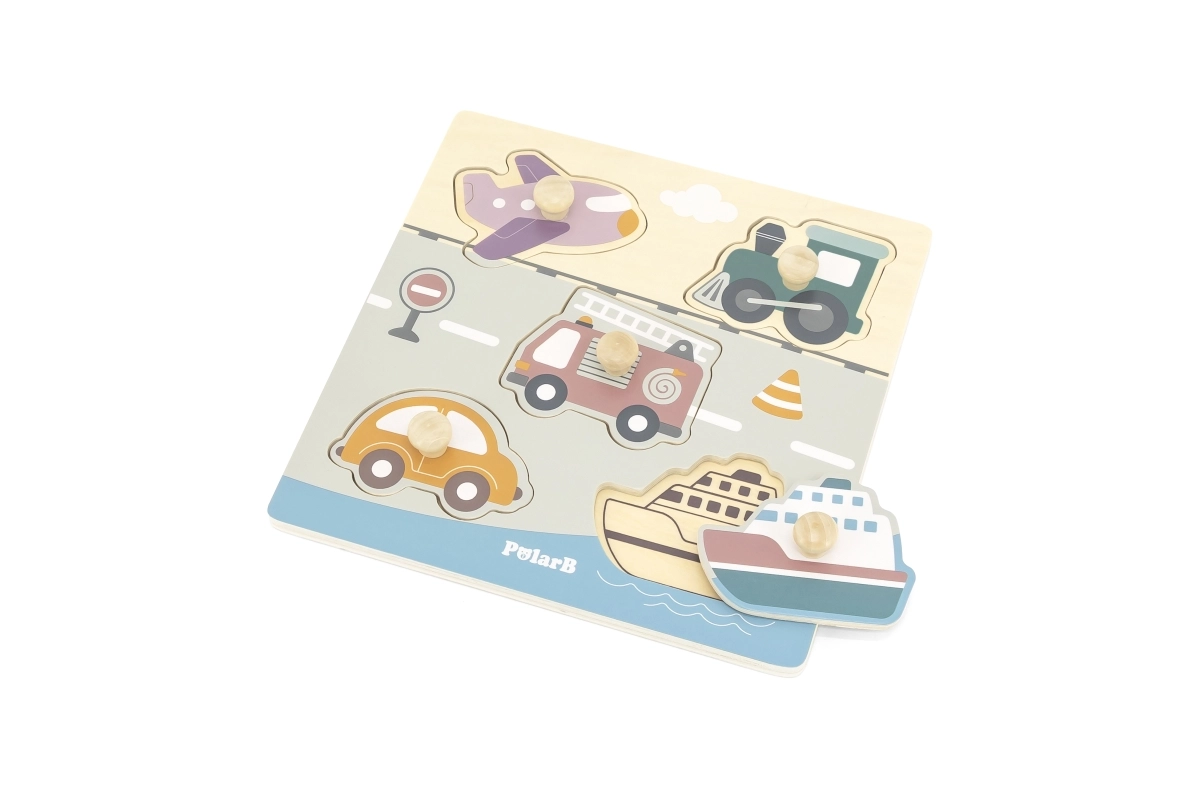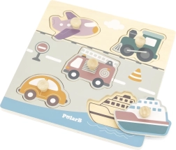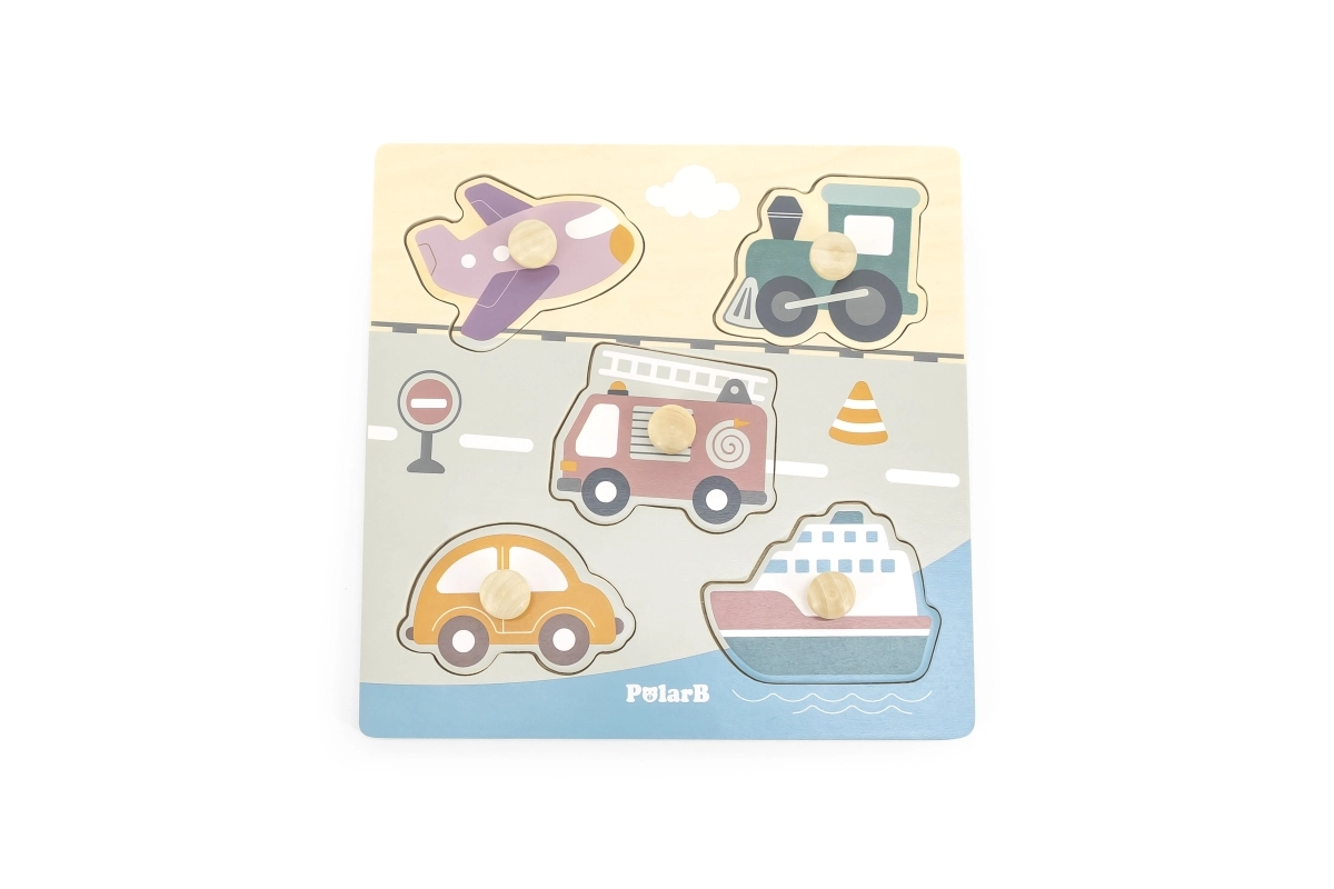 Træindlægningspuslespil med motiv af transportmidler. Mål på træpladen ca. 22 x 22 cm. Pakningsmål ca. 22 x 22 x 2,5 cm. Alder 18 m+.
