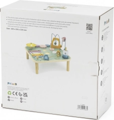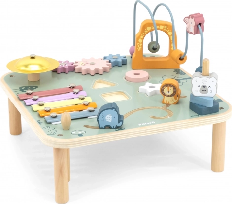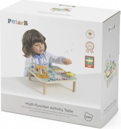 Træ-aktivitetbord VIGA PolarB giver børn fra 18 måneder timevis af opdagelse og kreativitet. Det kombinerer en kuglelabrint, xylofon, gong, formsortering, skydbare elementer og tandhjul. Overfladen er lakeret og farvet med giftfri farver i blide pastelfarver, som indbyder til leg og udvikler finmotorik, hånd-øje-koordination samt genkendelse af farver og former.