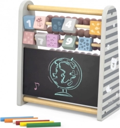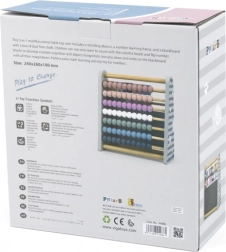 Dette multifunktionelle 3-i-1 trætæller forener læring og leg. Med farvede perler øver børn sig i at tælle, med vendbare klodser med tal lærer de at genkende cifre og enkle sammenhænge, og på kridttavlen kan de skrive eller tegne deres første regnestykker og billeder.
