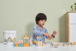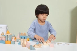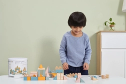 Forskellige former og størrelser (ca. 2,5–9 cm) gør det muligt for børn at bygge huse, tårne og hele byer og træne rumlig opfattelse.