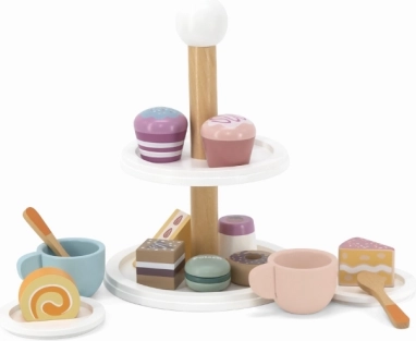 Det elegante stativ med to niveauer rummer alle kagerne og skaber en realistisk scene til tesalonen. Børn øver legende deres finmotorik, når de arrangerer.