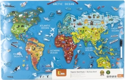 Med denne 2-i-1 undervisningstavle kan børn ikke kun tegne, men også opdage verden gennem magnetiske brikker, der repræsenterer kontinenter, transportmidler og havdyr. Kortet er på engelsk, hvilket hjælper med at lære engelsk gennem leg. Tavlen indeholder 106 brikker og er et fremragende værktøj til udvikling af forskellige færdigheder.
