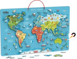 Kortet består af 106 magnetiske brikker, der repræsenterer lande, transportmidler og dyr, hvilket letter geografiundervisningen.