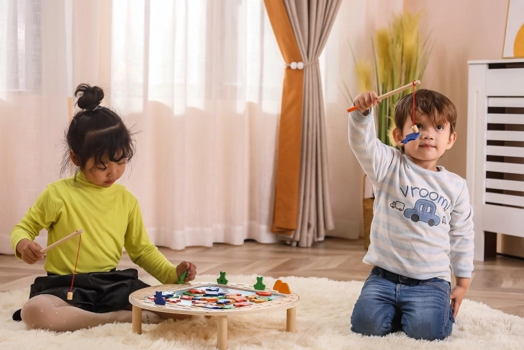 Et træbord med farverige fisk og fire stænger understøtter konkurrencedygtig leg og udvikling af motoriske færdigheder i fællesskab.