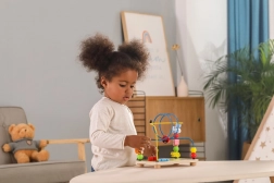 Legetøjet fanger opmærksomheden med sine klare farver og interessante perleformer, som motiverer børn til at udforske.