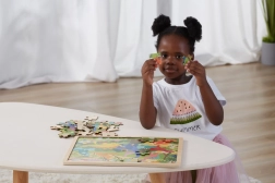 Det robuste træunderlag holder brikkerne på plads, gør det nemt at bære og opbevare og hjælper børn med at fokusere på at lægge motivet.