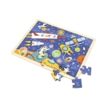 Dette kvalitets træpuslespil med 48 brikker giver børn et medrivende eventyr i rummet. De farverige illustrationer af planeter, raketter og astronauter fastholder opmærksomheden og stimulerer den naturlige nysgerrighed. Puslespillet ligger i en solid træramme, som gør det nemt at samle og transportere.