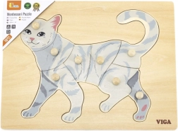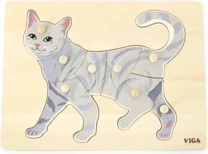 Barnets opgave er at samle kattemotivet ikke kun efter illustrationen, men også efter de enkelte brikkers form. Knopgrebene gør det nemt for små fingre at gribe og støtter korrekt håndføring. Den solide træplade holder brikkerne sikkert på plads og tåler daglig brug.