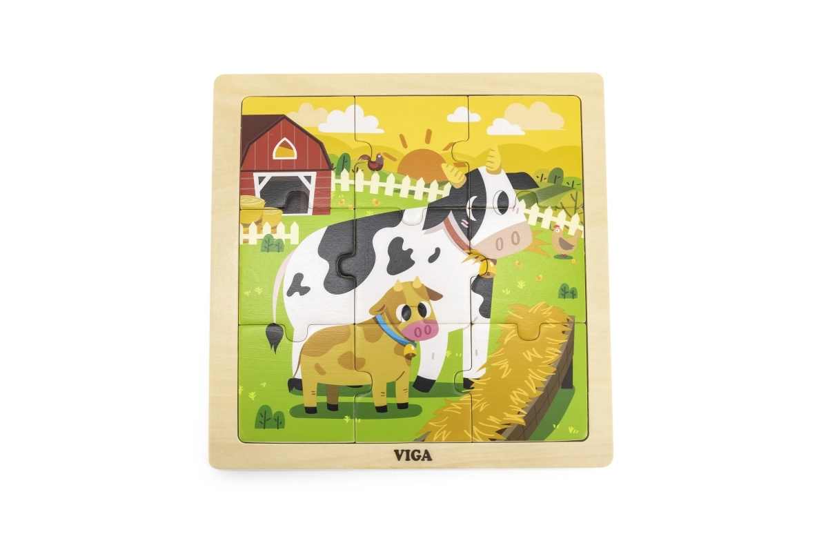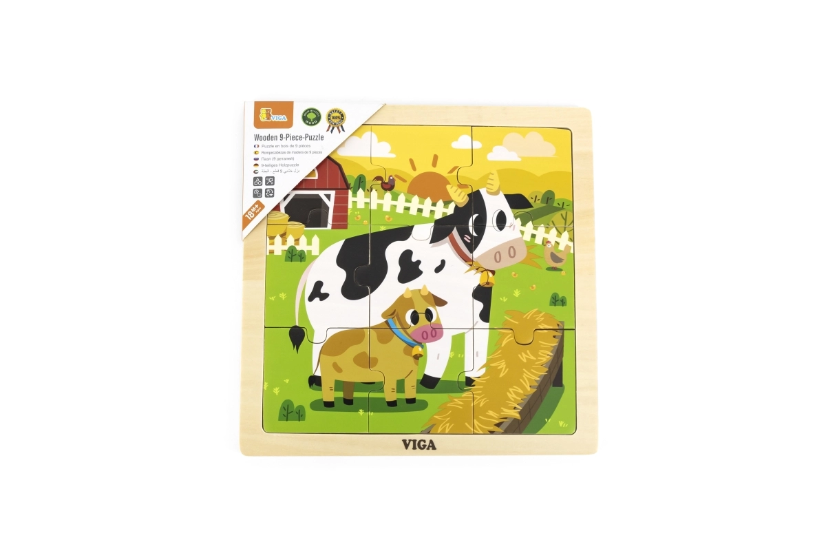 Træpuslespil med 9 brikker og et billede af køer. Træpladens mål ca. 22 x 22 x 1 cm. Pakkens mål ca. 22 x 22 x 1 cm. Alder 18 m+