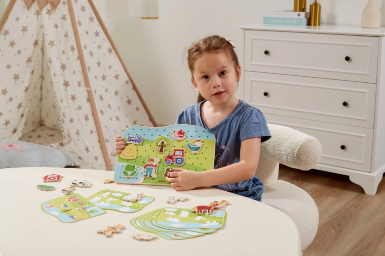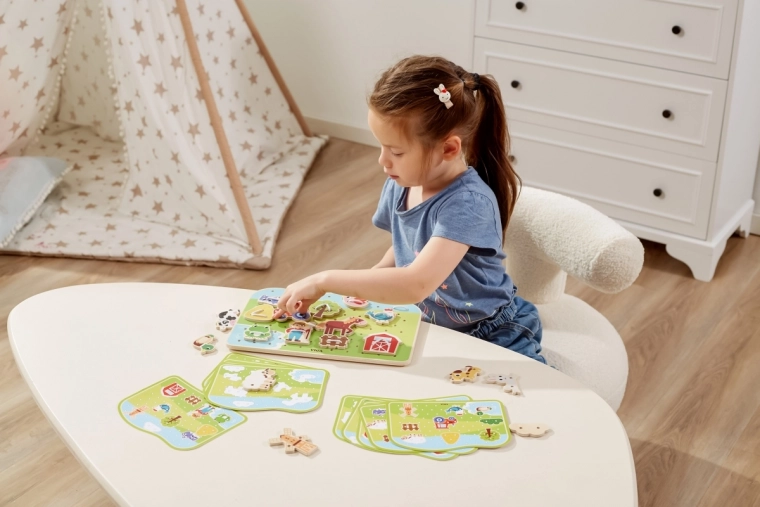 - Lærerig leg: genkendelse af farver og former, temaer fra gårdlivet.