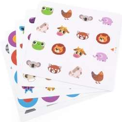 Der medfølger 10 dobbeltsidede kort med varierede motiver (dyr, genstande, planter). Du kan nemt skifte dem og tilpasse temaer og sværhedsgrad til barnets alder.