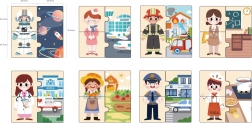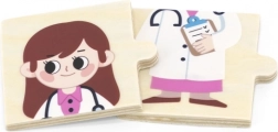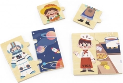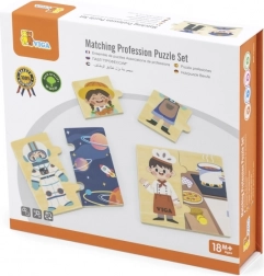 Den didaktiske træleg fra VIGA introducerer børn til forskellige professioner – fra læge og brandmand til kok eller astronaut. Hver profession består af tre dele: to til figuren og én større til arbejdsstedet. Børnene samler først den rigtige figur og forbinder den derefter med miljøet.