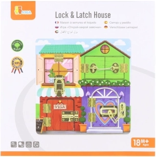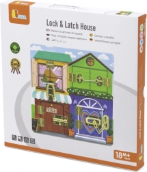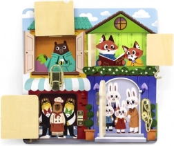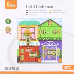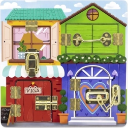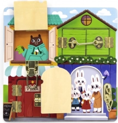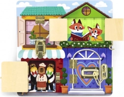 Denne kvalitets træplade inspireret af Montessori-metoden byder på fire døre med rigtige låse og beslag, som barnet gradvist låser op og lukker. Hver åbning afslører glade dyr, hvilket vækker nysgerrighed og koncentration.