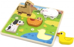 Dette søde træpuslespil med gårdtema indeholder 5 robuste brikker – hest, får, høne, hund og and. Børnene lægger dyrene i de tilsvarende huller på den farverige base og træner dermed formgenkendelse og visuel hukommelse.