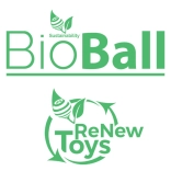 Støtte til bæredygtig leg med BioBall og ReNew Toys logoer, der understreger miljøvenlig produktion og ansvar.