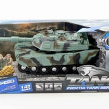 Oplev actionfyldt leg med en børnetank i mørk camouflage. Realistisk ledsagelse sikres af lydeffekter af skud og en lysende kanon ved tryk på en knap. Takket være svinghjulet kører tanken let ligeud uden behov for fjernbetjening.