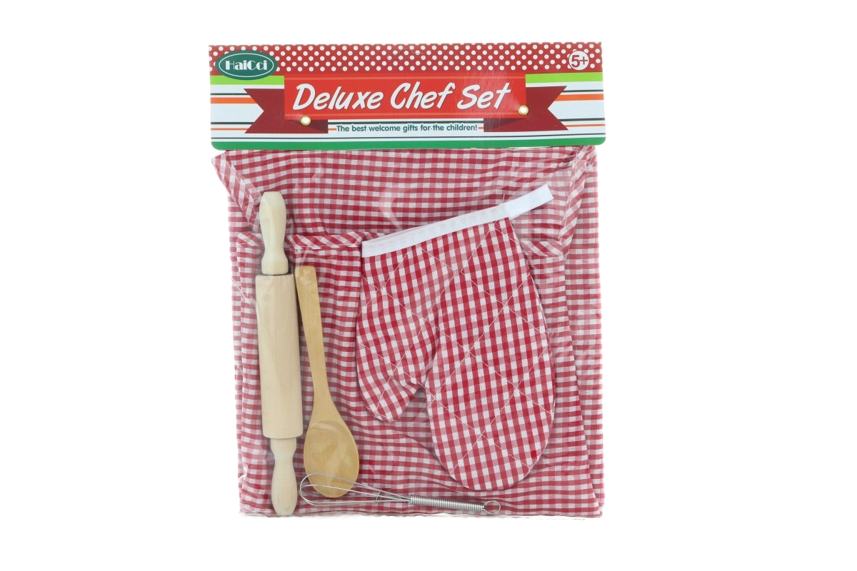 Sættet er designet til at være nemt at bruge for små hænder og understøtter selvstændighed, fantasi samt en positiv relation til mad og madlavning. Forklæde og grydelap beskytter tøjet og giver følelsen af at være en rigtig kok.