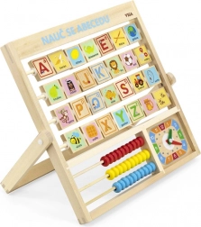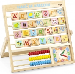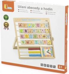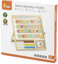 Træalfabet og ur på tjekkisk. Børn kan lære bogstaver, tal og få en generel forståelse af klokkeslæt. Hvert bogstav har et ord på bagsiden for bedre memorering. Mål ca. 32,5 x 32 x 2,3 cm. Pakkemål ca. 34 x 32,5 x 3 cm. Alder 3+