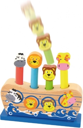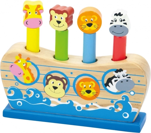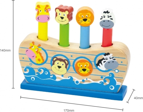 Den stabile træbase i form af et skib og fire træpinde med dyrefigurer (giraf, abe, løve, zebra) skaber et sikkert og holdbart legeområde. Den flotte emballage gør det til en ideel gave til småbørn og børnehavebørn.