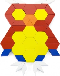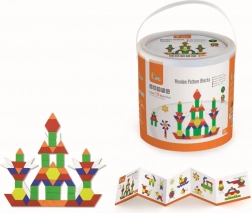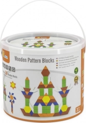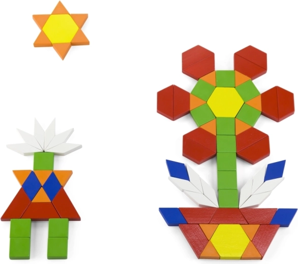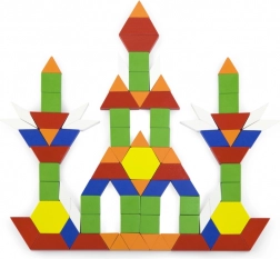 Det store antal flade træblokke i forskellige former og farver stimulerer fantasien og udvikler rumlig forestillingsevne. Børn kan lægge mønstre, dyr og hele billeder.