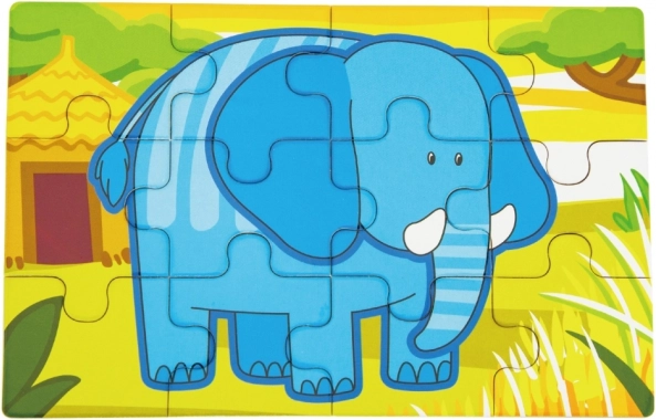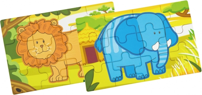 Enkle former og klare farver på løve, elefant, flodhest og abe motiverer børn til at lægge puslespil og styrker det visuelle fokus.