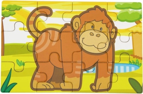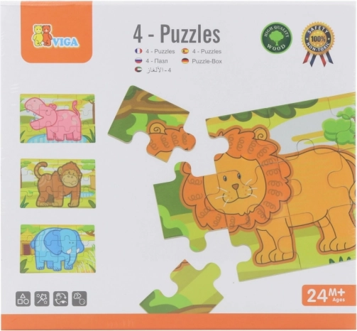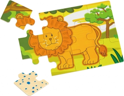 Dette sæt træpuslespil med glade jungledyr vil glæde ethvert barn. Hvert motiv har klare farver og enkle former, som gør det nemt at lægge og stimulerer barnets fantasi. Af brikkerne kan man samle både fire separate billeder og et langt panoramamotiv med alle dyrene.