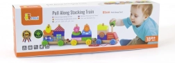 Dette kvalitets træ-træklokomotiv med tre vogne giver masser af muligheder for at stable og ombygge farvede former. Børn kan træne øje-hånd-koordination, lære farver og former at kende og samtidig nyde sjov ved at trække toget rundt i hjemmet.