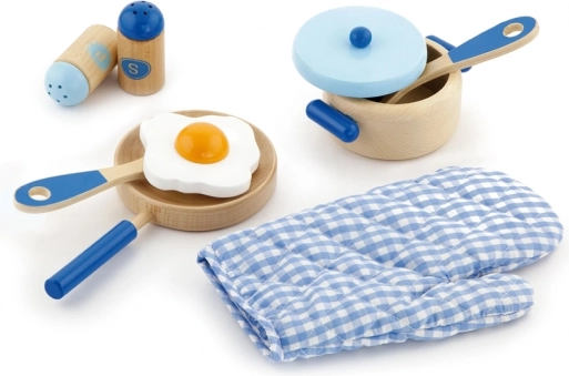 Dette træ-køkkensæt giver børn en autentisk madlavningsoplevelse. Med pande med æg, gryde med låg, saltkar og peberbøsse, træske og tekstil-grydelap kan børnene nemt skabe deres egne kulinariske fortællinger. Kvalitetsmaterialer i træ og holdbar forarbejdning sikrer lang levetid og sikker leg.