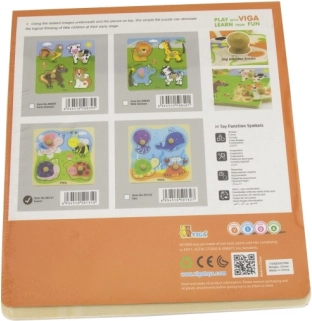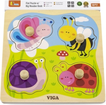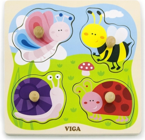 VIGA træpuslespil med 4 store brikker med håndtag er det ideelle første puslespil til de mindste. De farverige motiver af insekter og dyr fra engens verden motiverer børn til at udforske og lære. De fræsede kanter i den robuste træplade hjælper med, at hver brik bliver siddende sikkert på sin plads.
