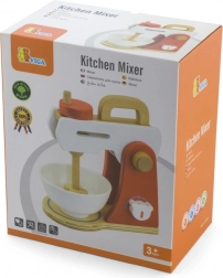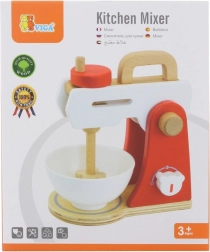 Mixeren har et rød-hvidt design og træelementer, der gør den til en realistisk kopi af en ægte køkkenmaskine.