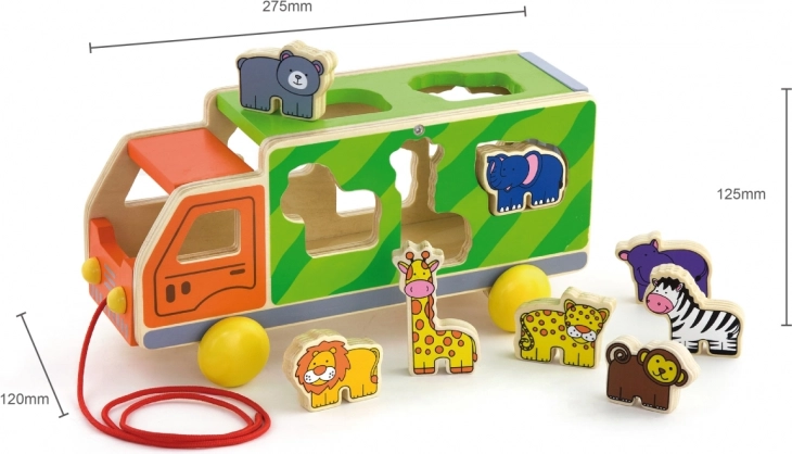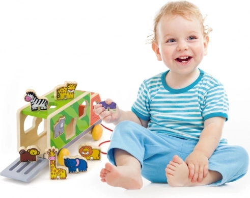 Denne farverige trælastebil kombinerer træklegetøj og puttekasse 2-i-1. Børn trækker lastbilen i snoren og lægger samtidig dyrene i de matchende huller, hvilket træner tålmodighed, logik og fingerfærdighed. De glat forarbejdede kanter og den robuste udførelse er som skabt til daglig leg.
