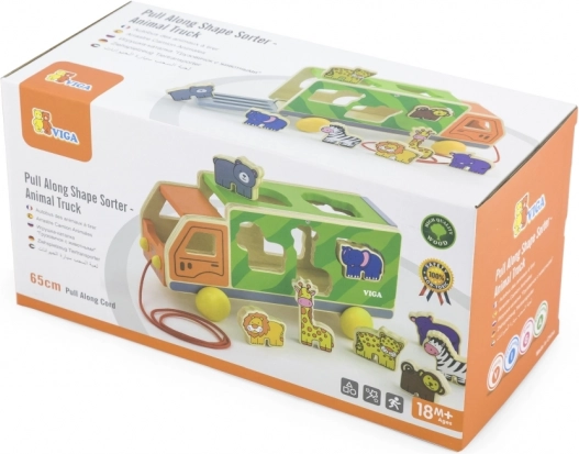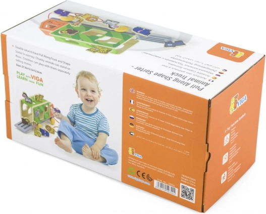 Lastbilen kan trækkes i snoren og fungerer samtidig som en smart puttekasse. Børn bruger både bevægelse og logik, når de finder de rigtige huller til dyrene.