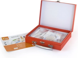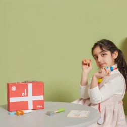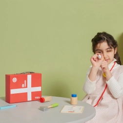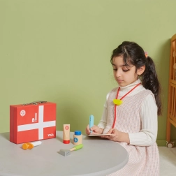 Dette smukke lægesæt i en solid trækuffert vil glæde alle små læger og sygeplejersker. Børn kan lytte til hjertet med stetoskop, “måle” temperaturen med termometer, give en sprøjte eller udfylde patientkort til bamser og dukker. Lægeleg er en sjov rolleleg, der udvikler sociale færdigheder, omsorg og empati.
