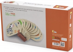 Sættet af trækort forbundet med en rød snor indeholder forskellige billeder, bogstaver og engelske navne på hvert kort. Dette legetøj lærer børn bogstaver, udvikler motoriske færdigheder og tilbyder de første ord på engelsk.