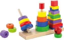 De forskellige former og farver af træbrikker lærer børn at genkende og benævne former og farver.
