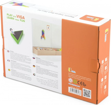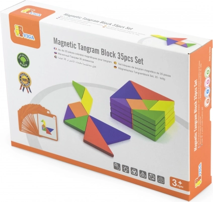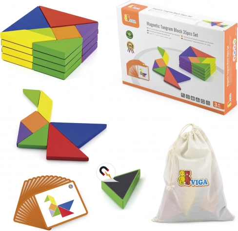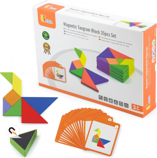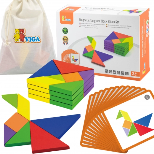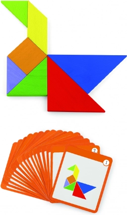 Dette farverige trætangram er et ideelt redskab til hjemmel leg og førskoleundervisning. Børn lægger billeder efter de medfølgende kort eller efter egen fantasi og udvikler dermed rumlig forestillingsevne, kreativitet og evnen til at løse problemer. De glatforarbejdede brikker i massivt træ er behagelige i hånden og holdbare til daglig brug.