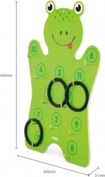 Indeholder en træplade formet som en frø og 6 ringe – det er bare at pakke ud og begynde at kaste.