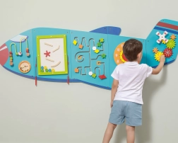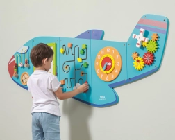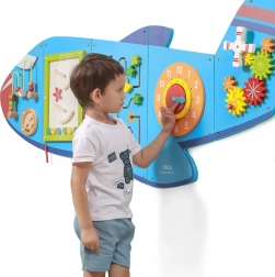 Trævægstavle i flyform fra mærket VIGA tilbyder børn en række forskellige og underholdende aktiviteter til at forbedre deres motoriske og kognitive evner. Den er ideel til børnehaver og offentlige områder.