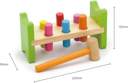 Denne træ-hammerbænk med mål ca. 22,5 × 12 × 7,7 cm giver børn timevis af meningsfuld leg. De farvede pinde bankes i med træhammeren, hvorved børn naturligt udvikler grebsstyrke, bevægelsespræcision og logisk tænkning. Den holdbare konstruktion og de glatte overflader sikrer sikker brug.
