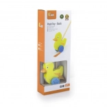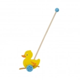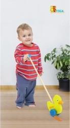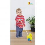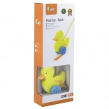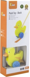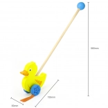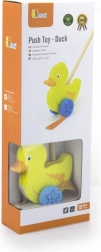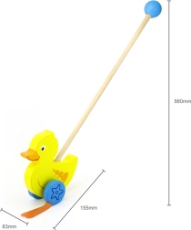 Træskubbe-and på en pind er et enkelt, men effektivt legetøj, som alle børn vil holde af. Det er et klassisk legetøj, der giver mange fordele. Den søde gule and bevæger energisk benene under kørsel, hvilket motiverer børn til at gå ture. Legetøjet er pakket i en pæn kasse med vindue, som gør det muligt at se anden. Indeni er der en pind med håndtag, der passer perfekt til barnets lille hånd. Pinden er ikke fastmonteret, hvilket gør den nem at opbevare. Hele legetøjet er lavet af bøgetræ og malet med giftfri maling i livlige farver, der tiltrækker opmærksomhed og opmuntrer til leg, hvilket giver masser af legeglæde.
