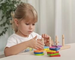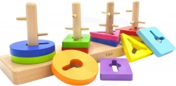 Ved at sætte forskellige former på træpindene understøtter legetøjet udviklingen af finmotorik og hånd-øje-koordination.