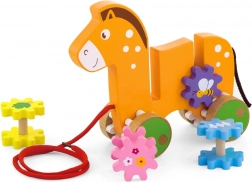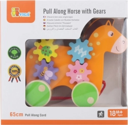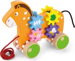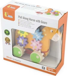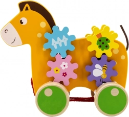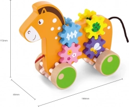 Hesten har farverige tandhjul, som drejer rundt, når legetøjet bevæges, hvilket hjælper små børn med at udvikle deres motoriske færdigheder.